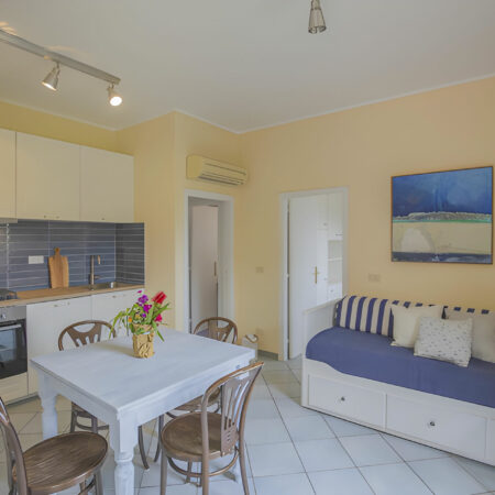 Villetta 4 posti letto mq. 40 con aria condizionata: Soggiorno con divano letto matrimoniale/singolo comodamente estraibile, tv , cucina completamente equipaggiata con forno elettrico e lavastoviglie, camera matrimoniale, bagno-doccia. Veranda esterna privata attrezzata (tavolo-sedie-sdraio).